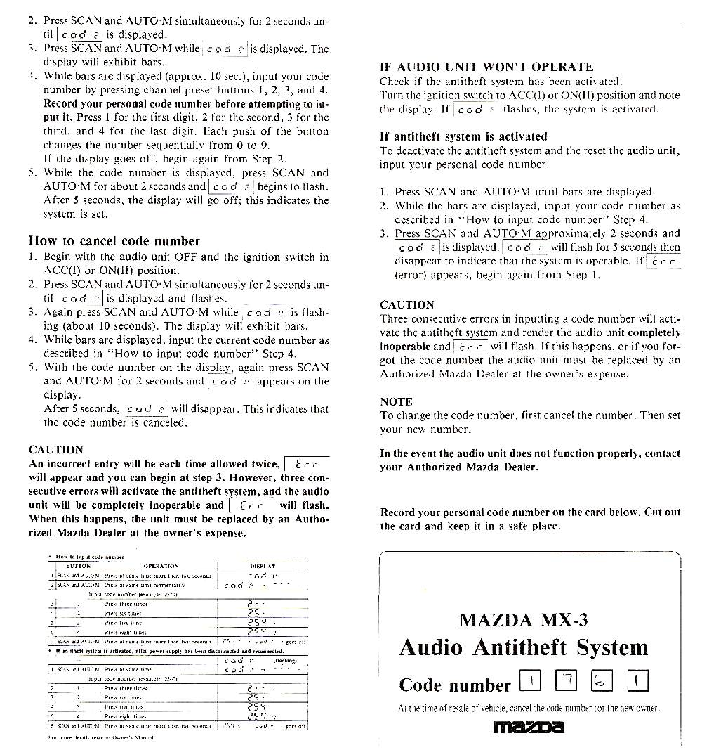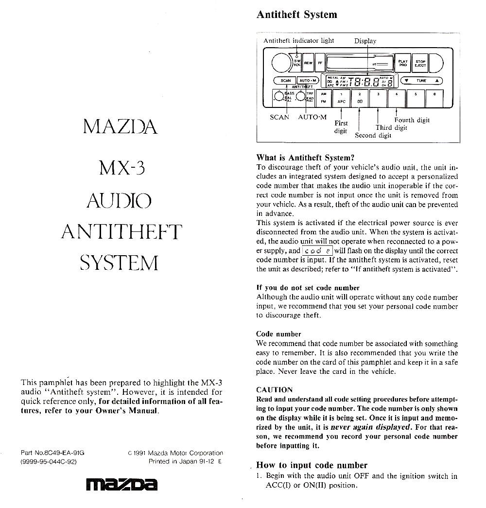 A. The following two images are from the Official Mazda MX-3 Audio Anti-theft System Pamphlet.