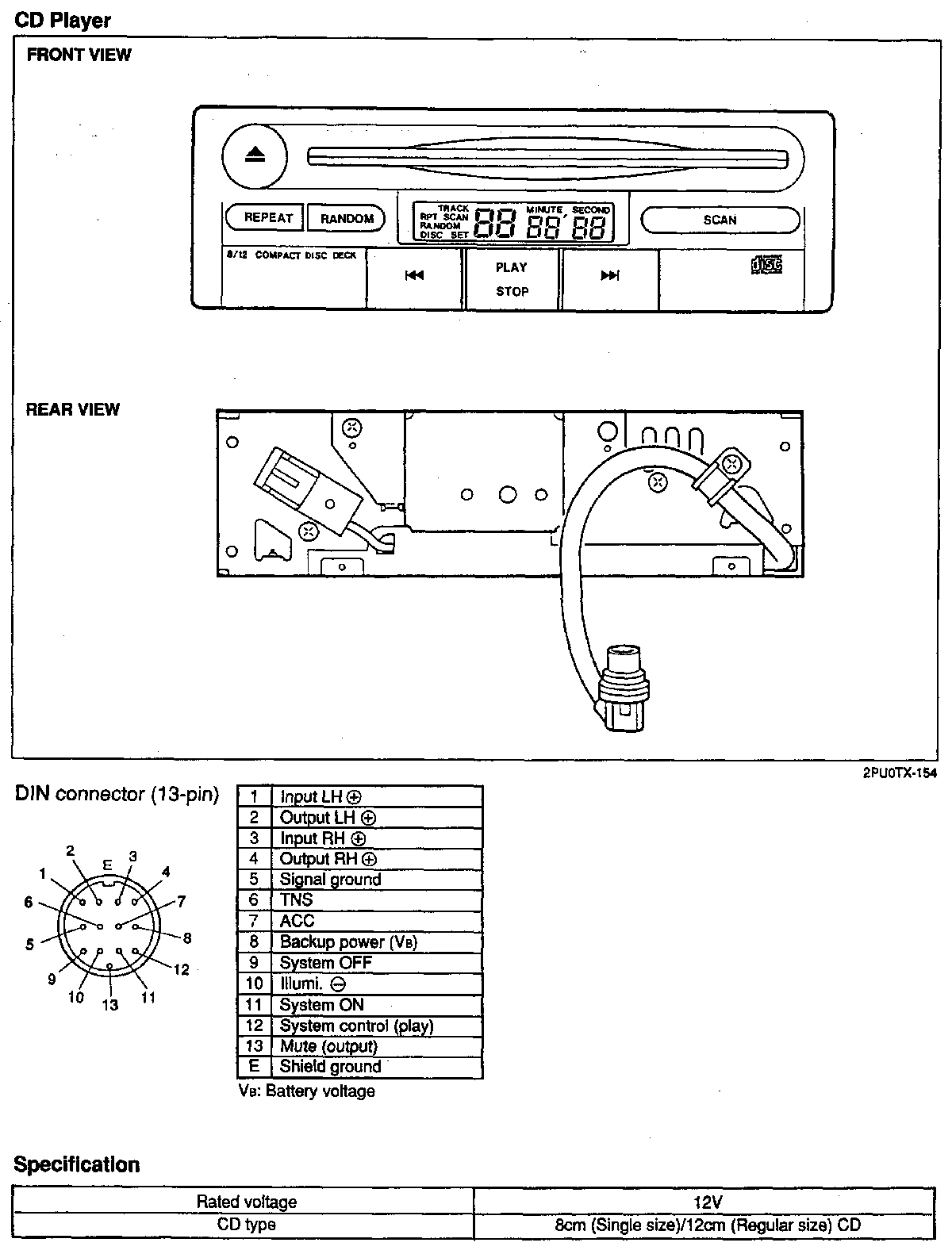 - Schematic of Optional CD Player, includes a diagram of the 13-Pin DIN connector and its specific pin-outs. (Scanned from 1993 Mazda MX-3 Electrical Manual.)