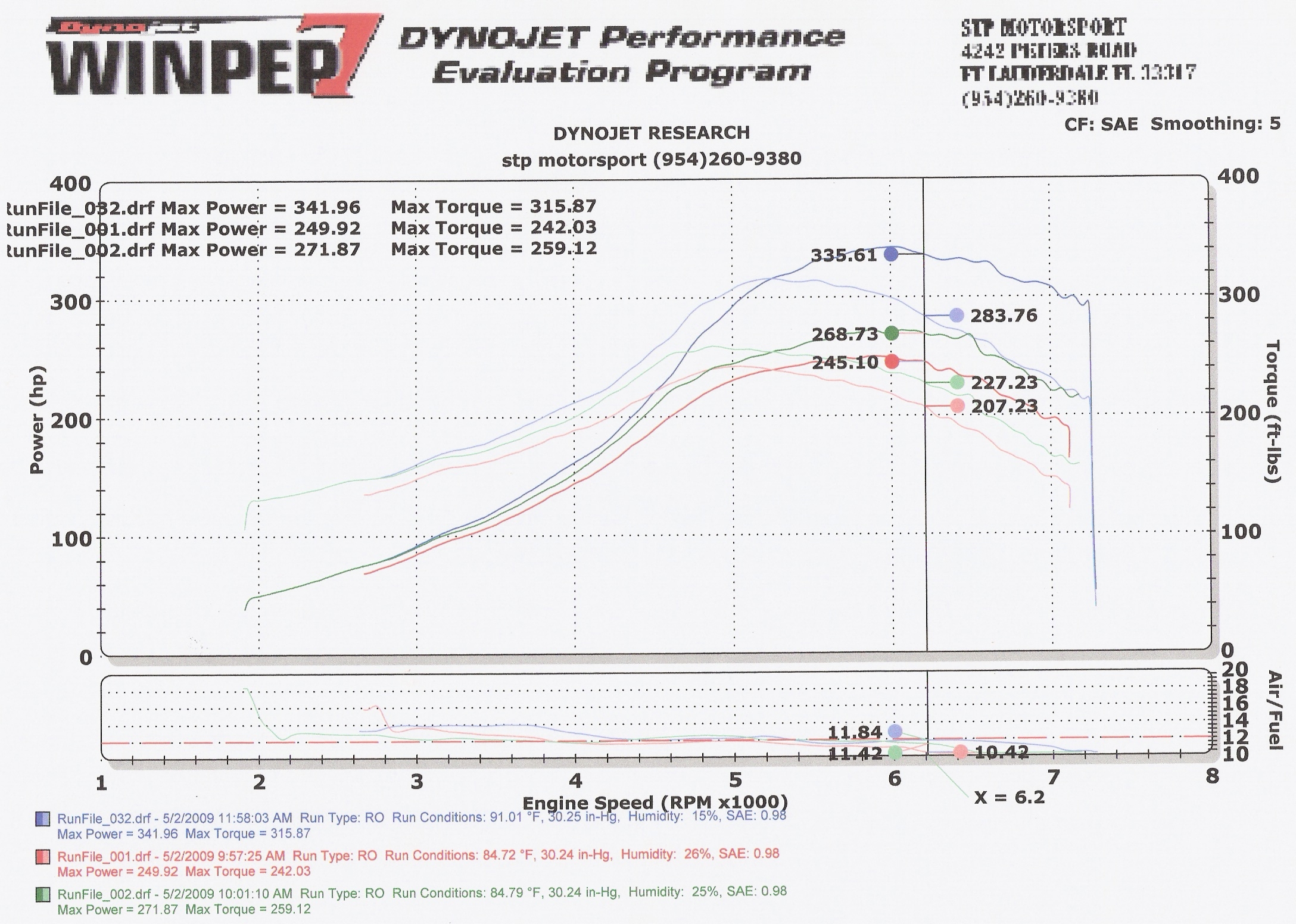 Run #3 (cutout open, boost controller on) - 341.96whp/315wtq, this was on 14psi. Only made two passes on this setting because I was running out of time. It's just beginning to touch the efficiency of the SC61 so with some more tuning I might be able to squeeze a 350whp out of 14psi, not sure, but it's a goal.